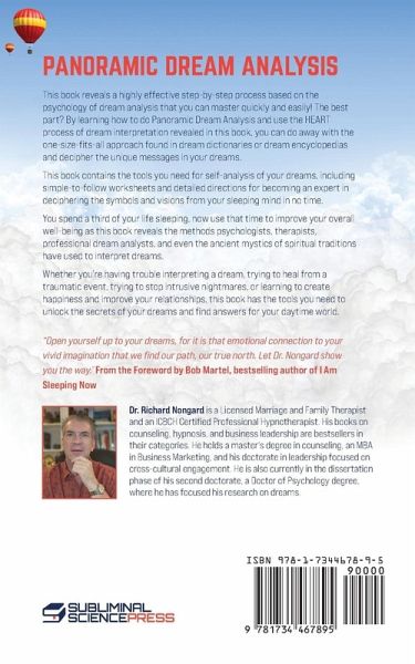 This book teaches you the easy-to-follow methods of dream analysis that Dr. Richard Nongard has taught countless others over his 30+ years as a professional psychotherapist. Imagine not only learning the true meaning of your dreams but being able to understand them from a panoramic perspective so that you can find the important connections to your relationships, your actions, and your emotions. This book reveals a highly effective step-by-step process based on the psychology of dream analysis that you can master quickly and easily! The best part? By learning how to do Panoramic Dream Analysis and using the HEART process of dream interpretation revealed in this book, you can do away with the one-size-fits-all approach found in dream dictionaries or dream encyclopedias and decipher the unique messages in your dreams. You spend a third of your life sleeping, now, use that time to improve your overall well-being as this book reveals the methods psychologists, therapists, professional dream analysts, and even the ancient mystics of spiritual traditions have used to interpret dreams. Whether you're having trouble deciphering a dream, trying to heal from a traumatic event, trying to stop intrusive nightmares, or learning to create happiness and improve your relationships, this book has the tools you need to unlock the secrets of your dreams and find answers for your daytime world.