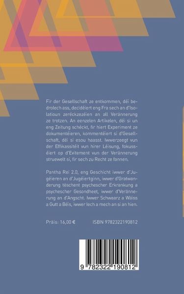 Panta Rhei 2.0, eng Geschicht iwwert d'Jugeiren an d'Jugeiert ginn, iwwert d'Graadwanderung zweschen psychescher Gesondheet an psychescher Erkrankung, iwwert d'Verännerung an d'Angscht. Iwwert schwarz a waiss a gutt a beis, iwwert iech a mech a si an hien.