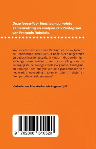 Wat moeten we leren van Pantagruel, de mijlpaal in de Renaissance literatuur? Dit boek is een uitgebreide en gedetailleerde leesgids. U vindt in dit boekje : - Een volledige samenvatting - Een voorstelling van de belangrijkste personages zoals Gargantua, Pantagruel en Panurge - Een analyse van de bijzonderheden van het werk: opvoeding, talen en talen, religie en het genre: een parodie op ridderromans Een referentieanalyse om snel de betekenis van het werk te begrijpen.