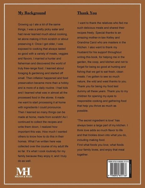 I want to thank the relatives who fed me such delicious meals and shared their recipes freely. Special thanks to an amazing mother-in-law Kelley and Grandma Carol who are masters in the Kitchen. I also want to thank my Husband for his support throughout writing this book, for helping me in the garden, the coop, and kitchen and not to forget for being so good at hunting and fishing that we get to eat fresh, clean meats. I've gotten to see so much nature, the wild and west thanks to you. Thank you for being my food test dummy all these years. Thank you to my children for opening my eyes to responsible cooking and gathering food that help you thrive as much as possible. "The secret ingredient is love" has always been a large part of my kitchen. I think love adds so much flavor to life and that trickles down into what you do, including making food. Find what foods you love, what foods your family loves, and enjoy that meal together.