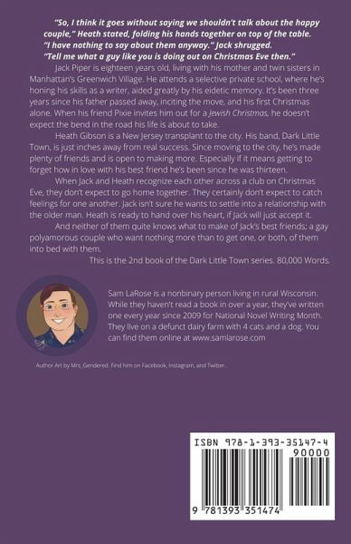 "So, I think it goes without saying we shouldn't talk about the happy couple," Heath stated, folding his hands together on top of the table. "I have nothing to say about them anyway." Jack shrugged. "Tell me what a guy like you is doing out on Christmas Eve then." Jack Piper is eighteen years old, living with his mother and twin sisters in Manhattan's Greenwich Village. He attends a selective private school, where he's honing his skills as a writer, aided greatly by his eidetic memory. It's been three years since his father passed away, inciting the move, and his first Christmas alone. When his friend Pixie invites him out for a Jewish Christmas, he doesn't expect the bend in the road his life is about to take. Heath Gibson is a New Jersey transplant to the city. His band, Dark Little Town, is just inches away from real success. Since moving to the city, he's made plenty of friends and is open to making more. Especially if it means getting to forget how in love with his best friend he's been since he was thirteen. When Jack and Heath recognize each other across a club on Christmas Eve, they don't expect to go home together. They certainly don't expect to catch feelings for one another. Jack isn't sure he wants to settle into a relationship with the older man. Heath is ready to hand over his heart, if Jack will just accept it. And neither of them quite knows what to make of Jack's best friends; a gay polyamorous couple who want nothing more than to get one, or both, of them into bed with them.