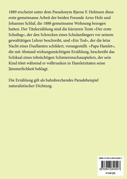 Arno Holz, Johannes Schlaf: Papa Hamlet Lesefreundlicher Großdruck in 16-pt-Schrift 1889 erscheint unter dem Pseudonym Bjarne F. Holmsen diese erste gemeinsame Arbeit der beiden Freunde Arno Holz und Johannes Schlaf, die 1888 gemeinsame Wohnung bezogen hatten. Der Titelerzählung sind die kürzeren Texte »Der erste Schultag«, der den Schrecken eines Schulanfängers vor seinem gewalttätigen Lehrer beschreibt, und »Ein Tod«, der die letze Nacht eines Duellanten schildert, vorangestellt. »Papa Hamlet«, die mit Abstand wirkungsmächtigste Erzählung, beschreibt das Schiksal eines tobsüchtigen Schmierenschauspielers, der sein Kind tötet während er volltrunken in Hamletzitaten seine Jämmerlichkeit beklagt. Die Erzählung gilt als bahnbrechendes Paradebeispiel naturalistischer Dichtung. Großformat, 210 x 297 mm Berliner Ausgabe, 2019 Durchgesehener Neusatz bearbeitet und eingerichtet von Theodor Borken Erstdruck unter dem Pseudonym Bjarne P. Holmsen, Leipzig (Verlag Carl Reissner) 1889. Der Text folgt der Ausgabe: Neue Gleise. Gemeinsames von Arno Holz und Johannes Schlaf, Berlin (F. Fontane) 1892, aus der auch die beiden Vorworte stammen. Textgrundlage ist die Ausgabe: Arno Holz und Johannes Schlaf: Papa Hamlet. Herausgegeben und mit einem Nachwort von Theo Meyer, Frankfurt a.M.: Suhrkamp, 1979 [Bibliothek Suhrkamp, Band 620]. Umschlaggestaltung von Thomas Schultz-Overhage unter Verwendung des Bildes: Thomas Betterton als Hamlet, um 1660, Künstler unbekannt. Gesetzt aus der Minion Pro, 16 pt. Henricus Edition Deutsche Klassik UG (haftungsbeschränkt) Über den Autor: 1863 in Ostpreußen als Apothekersohn geboren, 1875 nach Berlin übergesiedelt, bricht Arno Holz die Schule ohne Abschluss ab und lebt als freier Schriftsteller in wirtschaftlich schwierigen Verhältnissen im Berliner Wedding. Seine Lyrik entwickelt sich ab 1885 um die soziale Frage herum, er tritt dem naturalistischen Literaturverein »Durch!« bei und wird in der literarischen Avantgarde, die ihn trotz junger Jahre halb liebevoll, halb spöttisch »Papa Holz« nennt, ein ebenso aktiver wie sendungsbewußter Mann. »Kunst=Natur-X« ist die Formel, auf die Holz das Ziel künstlerischen Schaffens bringt. 1887 zieht er mit seinem Freund Johannes Schlaf zusammen und schreibt gemeinsam mit ihm unter dem Pseudonym Bjarne P. Holmsen eine Reihe naturalistischer Werke bis sie sich über die Aufteilung der kargen Honorare in einem öffentlich geführten Streit entzweien. Er erhält die Ehrendoktorwürde der Universität Königsberg, wird Mitglied der Preußischen Akademie der Künste zu Berlin und als Kandidat für den Literatur-Nobelpreis nominiert. Alfred Döblin schreibt über Arno Holz: »Er war bis zuletzt eine Lehrernatur, ein Mann, der etwas bestimmt wußte und es demonstrierte.« Arno Holz starb am 26.10.1929 in Berlin.