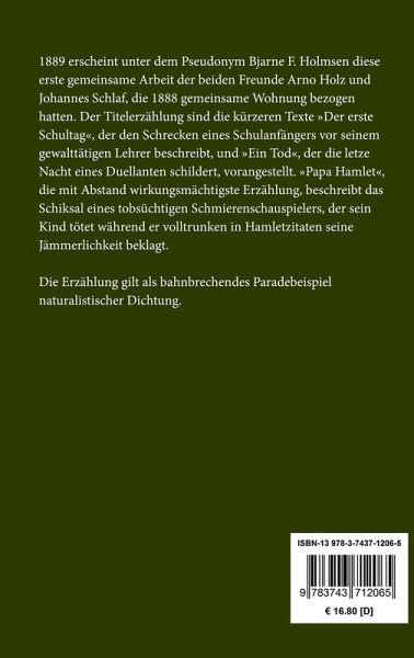 1889 erscheint unter dem Pseudonym Bjarne F. Holmsen diese erste gemeinsame Arbeit der beiden Freunde Arno Holz und Johannes Schlaf, die 1888 gemeinsame Wohnung bezogen hatten. Der Titelerzählung sind die kürzeren Texte "Der erste Schultag", der den Schrecken eines Schulanfängers vor seinem gewalttätigen Lehrer beschreibt, und "Ein Tod", der die letze Nacht eines Duellanten schildert, vorangestellt. "Papa Hamlet", die mit Abstand wirkungsmächtigste Erzählung, beschreibt das Schiksal eines tobsüchtigen Schmierenschauspielers, der sein Kind tötet während er volltrunken in Hamletzitaten seine Jämmerlichkeit beklagt.