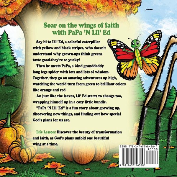 Soaring on the Wings of Faith with PaPa and Lil' Ed Say hi to Lil' Ed, a colorful caterpillar with yellow and black stripes, who doesn't understand why grown-ups think greens taste good-they're so yucky! Then he meets PaPa, a kind granddaddy long legs spider with lots and lots of wisdom. Together, they go on amazing adventures up high, watching the world turn from green to brilliant colors like orange and red. An just like the leaves, Lil' Ed starts to change too, wrapping himself up in a cozy little bundle. "PaPa 'N Lil' Ed" is a fun story about growing up, discovering new things, and finding out how special God's plans for us are. Life Lesson: Discover the beauty of transformation and faith, as God's plans unfold one beautiful wing at a time. Lynn Steigleder Published by White Parrot Press, imprint of First Steps Publishing Christian Children's Fiction; Religious Picture Books; Inspirational Stories for Kids; Nature & Animal Children's Books For parents, guardians, educators or teachers looking for Christian-themed stories; growing up; bedtime story; educational material; inspirational gift for children; stories with moral lessons; children's ministry resources; Christian values