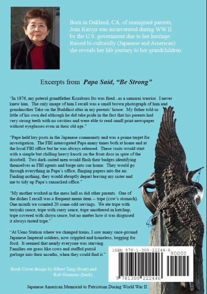 Kiyo Jean Kariya, a Nisei teenager when she was interned with her family in Topaz and is now in her 80's, shares the drama of her life's adventures with her grandchildren. Her parents returned to Japan after the war with Kiyo and her two siblings only to find themselves outcast foreigners in a devastated nation with a starving population. But, armed with bilingual skills and perseverance instilled by her parents, she is discovered by the global computer giant IBM and rises through the ranks. Her amazing story continues with her move to New York City, marriage to the co-founder of one of the most recognized names in ceramics, and association with ambassadors, movie stars and diplomats. "Papa Said Be Strong" is the riveting, inspiring life-history of a woman whose humble childhood was ignited and fueled into a rags-to-riches narrative by simple but powerful lessons from her parents.
