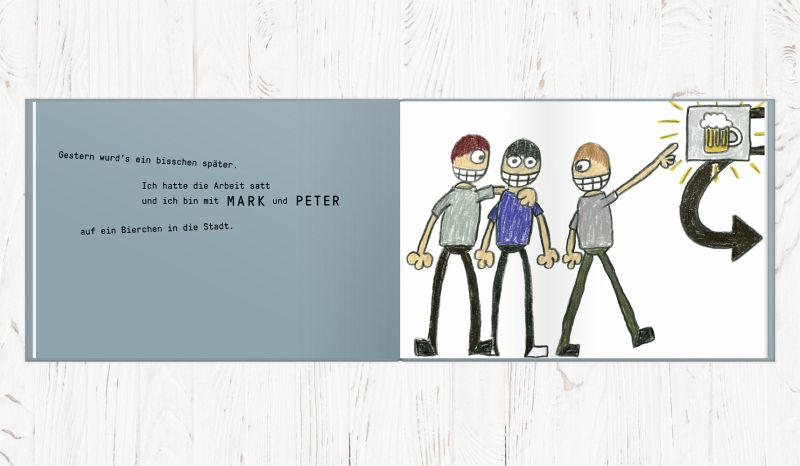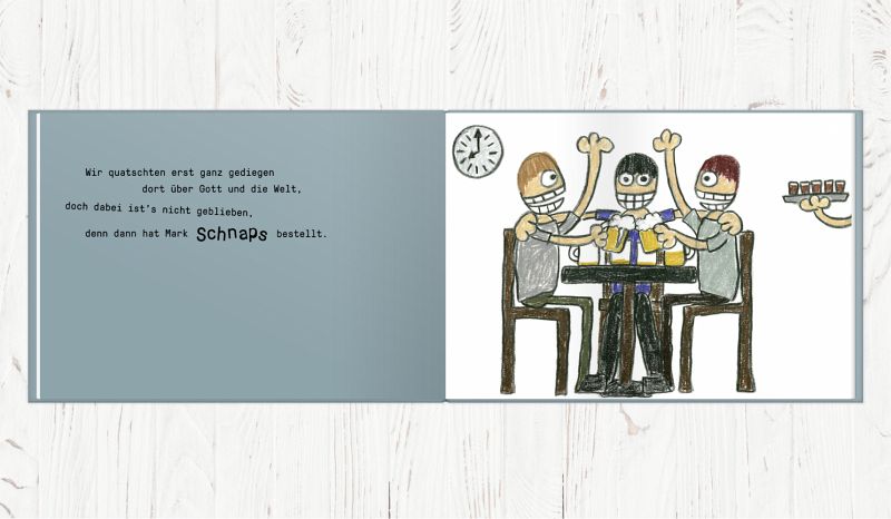 Das Bild auf den Cover fand ich ganz witzig. Aber im Buch mochte ich den Großteil der Bilder nicht wirklich. Besonders bei der ersten gereimten Geschichte gefielen mir die Bilder gar nicht. Dieses Wirrwarr bei der Sauftour musste nicht sein. Es war eher wie Grekelkrakel. Schade. Paar wenige Bilder fand ich gut. Ich habe ja nichts gegen diesen Zeichenstil an sich, aber es war halt nicht wirklich berauschend für uns. Mein Mann mochte die Bilder gar nicht.