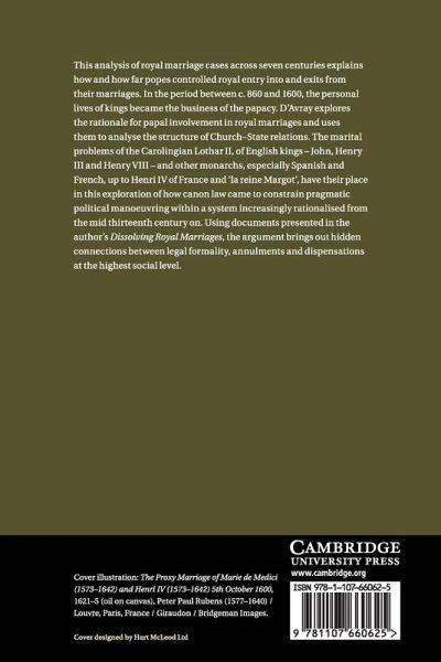This analysis of royal marriage cases across seven centuries explains how and how far popes controlled royal entry into and exits from their marriages. In the period between c.860 and 1600, the personal lives of kings became the business of the papacy. d'Avray explores the rationale for papal involvement in royal marriages and uses them to analyse the structure of church-state relations. The marital problems of the Carolingian Lothar II, of English kings - John, Henry III, and Henry VIII - and other monarchs, especially Spanish and French, up to Henri IV of France and La Reine Margot, have their place in this exploration of how canon law came to constrain pragmatic political manoeuvring within a system increasingly rationalised from the mid-thirteenth century on. Using documents presented in the author's Dissolving Royal Marriages, the argument brings out hidden connections between legal formality, annulments, and dispensations, at the highest social level.