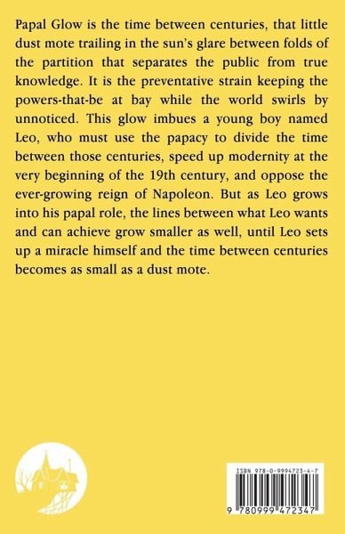 Papal Glow is the time between centuries, that little dust mote trailing in the sun's glare between folds of the partition that separates the public from true knowledge. It is the preventative strain keeping the powers-that-be at bay while the world swirls by unnoticed. This glow imbues a young boy named Leo, who must use the papacy to divide the time between those centuries, speed up modernity at the very beginning of the 19th century, and oppose the ever-growing reign of Napoleon. But as Leo grows into his papal role, the lines between what Leo wants and can achieve grow smaller as well, until Leo sets up a miracle himself and the time between centuries becomes as small as a dust mote.
