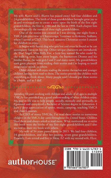 My wife, Karen and I, (Karen has passed away) had four children and 14 grandchildren. The birth of those grandchildren brought great joy to us and motivated me to create a story upon the birth of the first eight grandchildren, the first in 1986 and the last in 1998. Each chapter lists chronologically the names of these eight grandchildren. One of the stories was created as I was driving one night from a YMCA job interview in Chattanooga, Tennessee to Kokomo, Indiana, where I served as CEO. This book contains Christmas stories I created for children to enjoy. It begins with Santa's dog who gets lost and must be found so he can accompany Santa on his trip. Other unique characters are introduced, the Blue Angel, Miss Frilly Fox, a little boy named Bo who could fly, the walking trees, how snow began, the batmasters Desmo and his brother Rufus, the twin girls I and Y and many more. My grandchildren took great pleasure from reading their stories and I'm hoping to instill imaginative minds in others. Older children will enjoy reading the stories themselves and younger children having them read to them. The stories provide the children with something to think about. Many people said I should put these stories in a book, and so I did!