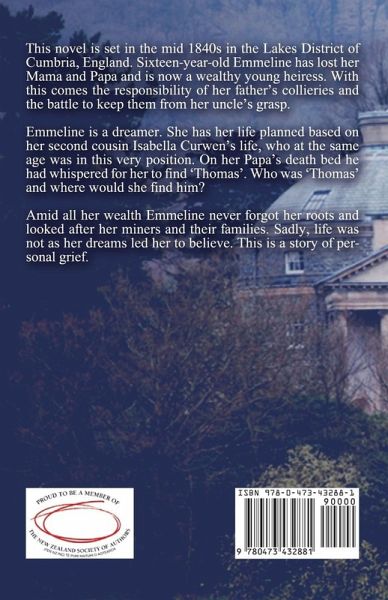 This novel is set in the mid 1840s in the Lakes District of Cumbria, England. Sixteen-year-old Emmeline has lost her Mama and Papa and is now a wealthy young heiress. With this comes the responsibility of her father’s collieries and the battle to keep them from her uncle’s grasp. Emmeline is a dreamer. She has her life planned based on her second cousin Isabella Curwen’s life, who at the same age was in this very position. On her Papa’s death bed he had whispered for her to find ‘Thomas’. Who was ‘Thomas’ and where would she find him? Amid all her wealth Emmeline never forgot her roots and looked after her miners and their families. Sadly, life was not as her dreams led her to believe. This is a story of personal grief.