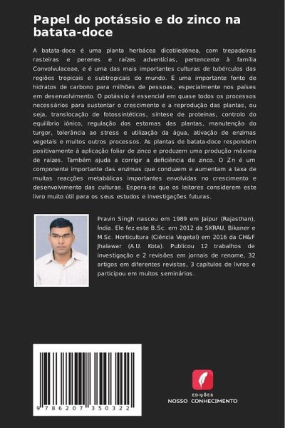 A batata-doce é uma planta herbácea dicotiledónea, com trepadeiras rasteiras e perenes e raízes adventícias, pertencente à família Convolvulaceae, e é uma das mais importantes culturas de tubérculos das regiões tropicais e subtropicais do mundo. É uma importante fonte de hidratos de carbono para milhões de pessoas, especialmente nos países em desenvolvimento. O potássio é essencial em quase todos os processos necessários para sustentar o crescimento e a reprodução das plantas, ou seja, translocação de fotossintéticos, síntese de proteínas, controlo do equilíbrio iónico, regulação dos estomas das plantas, manutenção do turgor, tolerância ao stress e utilização da água, ativação de enzimas vegetais e muitos outros processos. As plantas de batata-doce respondem positivamente à aplicação foliar de zinco e produzem uma produção máxima de raízes. Também ajuda a corrigir a deficiência de zinco. O Zn é um componente importante das enzimas que conduzem e aumentam a taxa de muitas reacções metabólicas importantes envolvidas no crescimento e desenvolvimento das culturas. Espera-se que os leitores considerem este livro muito útil para os seus estudos e investigações futuras.
