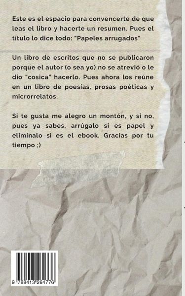 Este es el espacio para convencerte de que leas el libro y hacerte un resumen. Pues el título lo dice todo: "Papeles arrugados" Un libro de escritos que no se publicaron porque el autor (o sea yo) no se atrevió o le dio "cosica" hacerlo. Pues ahora los reúne en un libro de poesías, prosas poéticas y microrrelatos. Si te gusta me alegro un montón, y si no, pues ya sabes, arrúgalo si es papel y elimínalo si es el ebook. Gracias por tu tiempo ;)