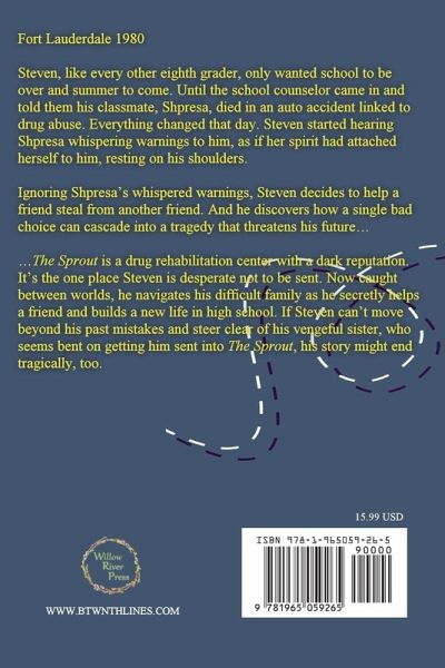 Fort Lauderdale 1980 Steven, like every other eighth grader, only wanted school to be over and summer to come. Until the school counselor came in and told them his classmate, Shpresa, died in an auto accident linked to drug abuse. Everything changed that day. Steven started hearing Shpresa whispering warnings to him, as if her spirit had attached herself to him, resting on his shoulders. Ignoring Shpresa's whispered warnings, Steven decides to help a friend steal from another friend, and he discovers how a single bad choice can cascade into a tragedy that threatens his future... ...The Sprout is a drug rehabilitation center with a dark reputation. It's the one place Steven is desperate not to be sent. Now caught between worlds, he navigates his difficult family as he secretly helps a friend and builds a new life in high school. If Steven can't move beyond his past mistakes and steer clear of his vengeful sister, who seems bent on getting him sent into The Sprout, his story might end tragically, too.