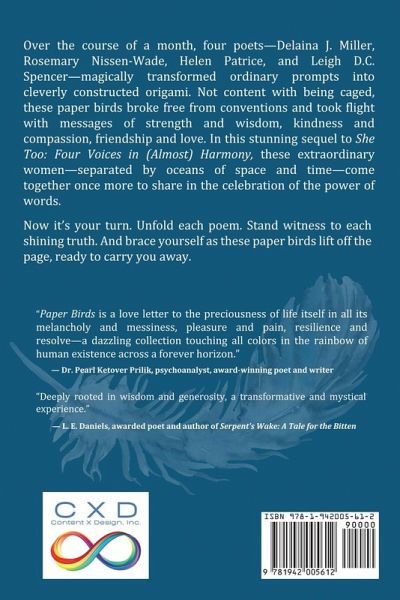 Paper Birds is a poetry anthology featuring the poetry of four incredible women as they explore themes of love, friendship, and compassion in today's world. Over the course of a month, four poets-Delaina J. Miller, Rosemary Nissen-Wade, Helen Patrice, and Leigh D.C. Spencer-magically transformed ordinary prompts into cleverly constructed origami. Not content with being caged, these paper birds broke free from conventions and took flight with messages of strength and wisdom, kindness and compassion, friendship and love. In this stunning sequel to She Too: Four Voices in (Almost) Harmony, these extraordinary women-separated by oceans of space and time-come together once more to share in the celebration of the power of words. Now it's your turn. Unfold each poem. Stand witness to each shining truth. And brace yourself as these paper birds lift off the page, ready to carry you away.