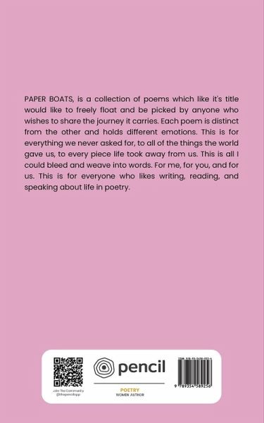 PAPER BOATS, is a collection of poems which like it's title would like to freely float and be picked by anyone who wishes to share the journey it carries. Each poem is distinct from the other and holds different emotions. This is for everything we never asked for, to all of the things the world gave us, to every piece life took away from us. This is all I could bleed and weave into words. For me, for you, and for us. This is for everyone who likes writing, reading, and speaking about life in poetry.