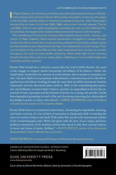 In Paper Cadavers, an inside account of the astonishing discovery and rescue of Guatemala's secret police archives, Kirsten Weld probes the politics of memory, the wages of the Cold War, and the stakes of historical knowledge production. After Guatemala's bloody thirty-six years of civil war (1960-1996), silence and impunity reigned. That is, until 2005, when human rights investigators stumbled on the archives of the country's National Police, which, at 75 million pages, proved to be the largest trove of secret state records ever found in Latin America. The unearthing of the archives renewed fierce debates about history, memory, and justice. In Paper Cadavers, Weld explores Guatemala's struggles to manage this avalanche of evidence of past war crimes, providing a firsthand look at how postwar justice activists worked to reconfigure terror archives into implements of social change. Tracing the history of the police files as they were transformed from weapons of counterinsurgency into tools for post-conflict reckoning, Weld sheds light on the country's fraught transition from war to an uneasy peace, reflecting on how societies forget and remember political violence.