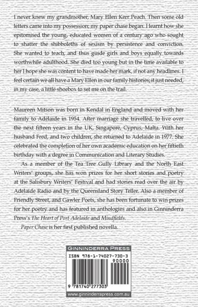 I never knew my grandmother, Mary Ellen Kerr Peach. Then some old letters came into my possession; my paper chase began. I learnt how she epitomised the young, educated women of a century ago who sought to shatter the shibboleths of sexism by persistence and conviction. She wanted to teach, and thus guide girls and boys equally towards worthwhile adulthood. She died too young but in the time available to her I hope she was content to have made her mark, if not any headlines. I feel certain we all have a Mary Ellen in our family histories; it just needed, in my case, a little shoebox to set me on the trail. Maureen Mitson was born in Kendal in England and moved with her family to Adelaide in 1954. After marriage she travelled, to live over the next fifteen years in the UK, Singapore, Cyprus, Malta. With her husband Fred, and two children, she returned to Adelaide in 1977. She celebrated the completion of her own academic education on her fiftieth birthday with a degree in Communication and Literary Studies. As a member of the Tea Tree Gully Library and the North East Writers' groups, she has won prizes for her short stories and poetry at the Salisbury Writers' Festival and had stories read over the air by Adelaide Radio and by the Queensland Story Teller. Also a member of Friendly Street, and Gawler Poets, she has been fortunate to win prizes for her poetry and has featured in anthologies and also in Ginninderra Press's The Heart of Port Adelaide and Mindfields. Paper Chase is her first published novella.