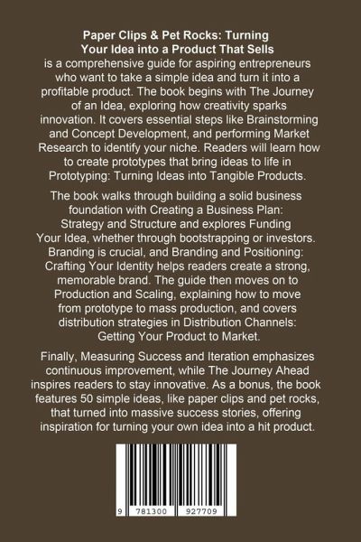 Paper Clips & Pet Rocks: Turning Your Idea into a Product that Sells is a practical, step-by-step guide for entrepreneurs looking to transform a simple idea into a marketable product. The journey starts with inspiration in The Journey of an Idea, where the book explores how creativity fuels innovation. It moves through the initial stages of Brainstorming and Concept Development, showing how to harness ideas and evaluate their potential. Identifying the right audience is crucial, and Market Research: Identifying Your Niche offers detailed methods to understand the market, pinpoint gaps, and position your idea for success. Once an idea is refined, it's time to bring it to life. Prototyping: Turning Ideas into Tangible Products explains how to create functional prototypes and gather feedback. From there, the book guides readers through the essentials of Creating a Business Plan: Strategy and Structure, providing templates and tips to build a clear roadmap for your business. Funding is a key challenge for many entrepreneurs, and Funding Your Idea: From Bootstrapping to Investors explores a range of options, from self-financing to securing investment. Branding plays a critical role in making a product memorable, and Branding and Positioning: Crafting Your Identity helps readers define a brand that resonates with customers. Scaling production from a small prototype to mass manufacturing is a major leap, and Production and Scaling: From Prototype to Mass Production lays out how to find reliable manufacturers, manage quality control, and scale efficiently. Once production is underway, Distribution Channels: Getting Your Product to Market covers the best ways to reach customers, from direct-to-consumer models to retail and wholesale strategies. The book concludes with a focus on Measuring Success and Iteration, emphasizing the importance of using data and customer feedback for continuous improvement. The Journey Ahead: Embracing Innovation and Growth inspires entrepreneurs to stay adaptable and keep pushing boundaries. Finally, as a source of inspiration, the book highlights 50 simple ideas that made huge profits, showing that even the simplest concepts, like paper clips and pet rocks, can become massive successes with the right approach.