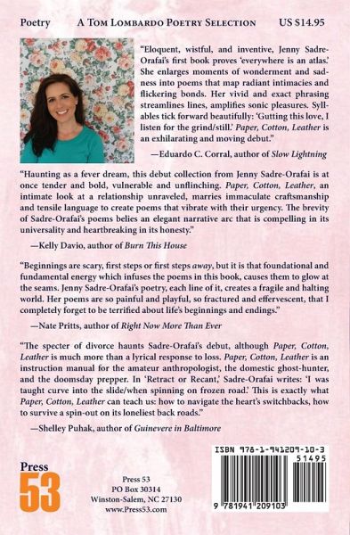 Eloquent, wistful, and inventive, Jenny Sadre-Orafai's first book proves "everywhere is an atlas." She enlarges moments of wonderment and sadness into poems that map radiant intimacies and flickering bonds. Her vivid and exact phrasing streamlines lines, amplifies sonic pleasures. Syllables tick forward beautifully: "Gutting this love, I listen for the grind/ still." Paper, Cotton, Leather is an exhilarating and moving debut. -Eduardo C. Corral