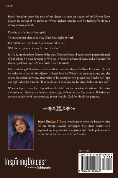 Hope Davidson meets the man of her dreams, a man on a quest of his lifelong Paper Dream. In pursuit of his ambition, Winn Prichard wrestles with his feelings for Hope, a strong woman of faith. Dare he risk falling in love again? To take another chance at love, Winn loses sight of truth. His mistakes are too burdensome to reveal to her. Will his deceptions destroy her love for him? In 1928, running from failures of the past, Winston Prichard passionately pursues his goal of publishing his own newspaper. Will lack of money, unwise choices, and a weakness for alcohol push his Paper Dreams further from fruition? His continuing difficulties cast doubt about a relationship with Hope Davidson. Should he make her a part of his odyssey? Hope?s love for Winn is all encompassing, and she shares his vision; however, discoveries of his transgressions plague her. Maybe her Papa was right when he warned, ?If he?s a skunk, I hope you see his stripe before it?s too late.? When each plan crumbles, Hope relies on her faith, yet she questions the wisdom of chasing the aspiration. Hope prays for a secure marriage without secrets. She wonders if desires are personal vanities or if they are placed in our heart by God for His divine purpose.