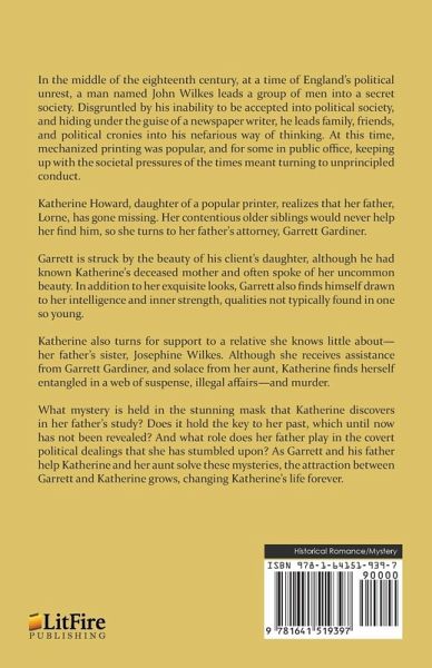 In the middle of the eighteenth century, at a time of England’s political unrest, a man named John Wilkes leads a group of men into a secret society. Disgruntled by his inability to be accepted into political society, and hiding under the guise of a newspaper writer, he leads family, friends, and political cronies into his nefarious way of thinking. At this time, mechanized printing was popular, and for some in public office, keeping up with the societal pressures of the times meant turning to unprincipled conduct. Katherine Howard, daughter of a popular printer, realizes that her father, Lorne, has gone missing. Her contentious older siblings would never help her find him, so she turns to her father’s attorney, Garrett Gardiner. Garrett is struck by the beauty of his client’s daughter, although he had known Katherine’s deceased mother and often spoke of her uncommon beauty. In addition to her exquisite looks, Garrett also finds himself drawn to her intelligence and inner strength, qualities not typically found in one so young. Katherine also turns for support to a relative she knows little about—her father’s sister, Josephine Wilkes. Although she receives assistance from Garrett Gardiner, and solace from her aunt, Katherine finds herself entangled in a web of suspense, illegal affairs—and murder. What mystery is held in the stunning mask that Katherine discovers in her father’s study? Does it hold the key to her past, which until now has not been revealed? And what role does her father play in the covert political dealings that she has stumbled upon? As Garrett and his father help Katherine and her aunt solve these mysteries, the attraction between Garrett and Katherine grows, changing Katherine’s life forever.
