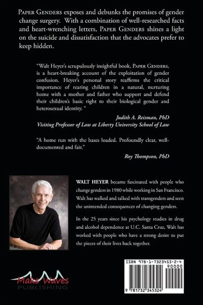 PAPER GENDERS exposes and debunks the promises of gender change surgery. With a combination of well-researched facts and heart-wrenching letters, PAPER GENDERS shines a light on the suicide and dissatisfaction that the advocates prefer to keep hidden. "Walt Heyer's scrupulously insightful book, Paper Genders, is a heart-breaking account of the exploitation of gender confusion." -Judith A. Reisman, PhD Visiting Professor of Law at Liberty University School of Law "A home run with the bases loaded. Profoundly clear, well-documented and fair. " -Roy Thompson, PhD