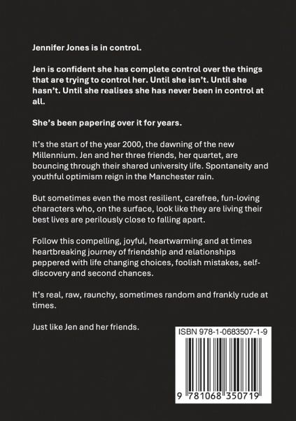 Jennifer Jones is in control. Jen is confident she has complete control over the things that are trying to control her. Until she isn't. Until she hasn't. Until she realises she has never been in control at all. She's been papering over it for years. It's the start of the year 2000, the dawning of the new Millennium. Jen and her three friends, her quartet, are bouncing through their shared university life. Spontaneity and youthful optimism reign in the Manchester rain. But sometimes even the most resilient, carefree, fun-loving characters who, on the surface, look like they are living their best lives are perilously close to falling apart. Follow this compelling, joyful, heartwarming and at times heartbreaking journey of friendship and relationships peppered with life changing choices, foolish mistakes, self-discovery and second chances. It's real, raw, raunchy, sometimes random and frankly rude at times. Just like Jen and her friends.