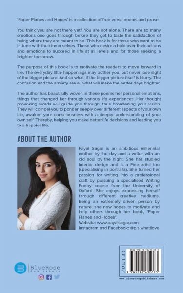 'Paper Planes and Hopes' is a collection of free verse poems and prose. You think you are not there yet? You are not alone. There are so many emotions one goes through before they get to taste the satisfaction of being there where they are meant to be. This book is for the thinkers. The ones who want to be well in-tuned with their inner self. Those who want to have a hold over their actions and emotions to succeed in life at all levels and for those seeking a brighter tomorrow. The purpose of this book is to motivate the reader to move forward in life. The little everyday happenings may bother you but, do not ever take your eyes off the bigger picture. And so what, if the bigger picture in itself is blurry? The confusion, the anxiety is all what will make the better days more brighter. The author has beautifully woven in these poems- her personal emotions, things that moved her and life experiences. Her thought provoking words in this book will guide you and broaden your vision. They'll compel you to ponder deep over different aspects of your own life, awaken your consciousness with deeper understanding of your own self. Thus, help you at taking better life decisions and leading you to a happier life. These poems and prose are for today's readers, who are always on the go. Most of them don't have much time or patience to sit down and read a whole book at one stretch. They are often disconnected and would rather read something which is like a quick read than something very lengthy. Everything in this book is like different pearls beaded in one fine necklace. It's all in a connected motion and yet not a continuation of each other. So every page that the reader opens, he'll find something very relatable that would move and motivate him or something that would make him think deep upon.