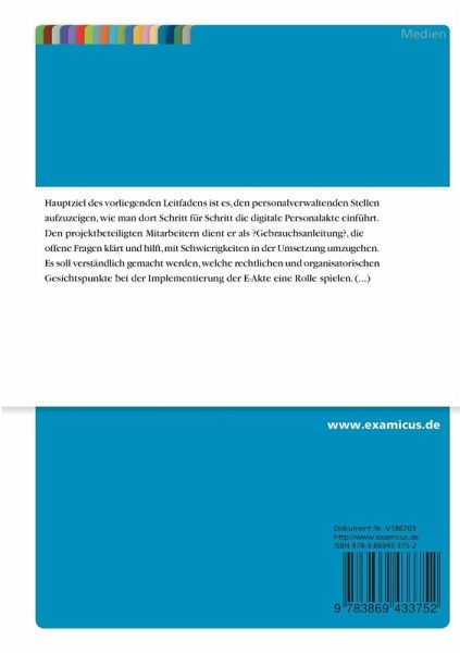 Diplomarbeit aus dem Jahr 2009 im Fachbereich Medien / Kommunikation - Multimedia, Internet, neue Technologien, Note: 1, Hochschule für öffentliche Verwaltung Kehl, Sprache: Deutsch, Anmerkungen: über 800 Seiten Anhang , Abstract: Hauptziel des vorliegenden Leitfadens ist es, den personalverwaltenden Stellen aufzuzeigen, wie man dort Schritt für Schritt die digitale Personalakte einführt.Den projektbeteiligten Mitarbeitern dient er als ?Gebrauchsanleitung?, die offene Fragen klärt und hilft, mit Schwierigkeiten in der Umsetzung umzugehen.Es soll verständlich gemacht werden, welche rechtlichen und organisatorischen Gesichtspunkte bei der Implementierung der E-Akte eine Rolle spielen. Gleichermaßen werden technische Möglichkeiten aufgezeigt sowie Problemlösungen und -ansätze dargestellt.Untergeordnet kann der Leitfaden auch als Entscheidungshilfe zur Einführung herangezogen werden, um sich ein Bild über die Thematik zu machen und den Aufwand abschätzen können, der auf die Personalstellen zukommt. Außerdem kann eine Wirtschaftlichkeitsabwägung (siehe 5.4) zeigen, ob die E-Akte wirklich die sinnvollste und nützlichste Lösung für die jeweilige Personalabteilung ist oder ob eine Einführung womöglich überhaupt nicht in Frage kommt. Keinesfalls soll der Leitfaden eine ?Werbemaßnahme? für die Digitalisierung sein. Vorteile und Nachteile dieser Art der Aktenablage werden aus neutralem Blickwinkel von allen Seiten beleuchtet. Ziel dieser Ausarbeitung ist ebenso, die Leser für den gewissenhaften Umgang mit dem Thema Datenschutz zu sensibilisieren.Diese Orientierungshilfe soll auch für jedermann ohne entsprechende EDV-Vorkenntnisse einleuchtend sein.Im Allgemeinen richtet sich dieser Leitfaden an alle öffentlichen Stellen des Landes Baden-Württemberg, welche noch mit Papierakten arbeiten und eine elektronische Aktenführung anstreben.Die Grundzüge der Vorgehensweise und die Struktur sind auf viele verschiedene Fachgebiete im öffentlichen Dienst anwendbar (z. B. Krankenhausverwaltung, Sparkassenverwaltung). Im Besonderen liegt der Schwerpunkt des Leitfadens allerdings auf der Digitalisierung der Personalakte, weshalb er vor allem personalaktenführende Stellen ansprechen soll.Explizit möchte der Leitfaden folgende Personenkreise ansprechen:- Behördenleiter? weil mit ihrer Entscheidung ein Projekt fällt oder steht- Führungskräfte der Personalverwaltungen? weil sie in der Regel als Projektleiter und Verantwortliche eingesetzt werden. Sie sind dafür zuständig, dass alle personalrechtlichen Anforderungen ordnungsgemäß umgesetzt werden- Stabsstellen der Verwaltungsmodernisierung... weil sie die nötigen Impulse an die Verwaltungsspitze herantragen; somit wirken sie auf eine mögliche Modernisierungsmaßnahme hin- Organisations- und EDV-Abteilungen? weil sie das erforderliche Organisationsgeschick haben, die nötigen Arbeitsabläufe bei der Umsetzung planen und ihr technisches Wissen hinsichtlich der EDV mit einbringen- Personalvertretung? weil sie die Interessen der Mitarbeiter vertritt und mitbestimmende Funktion ausübt- Datenschutzbeauftragte? weil der Schutz von personenbezogenen Daten bei der digitalen Personalakte eine erhebliche Rolle spielt- sowie alle Mitarbeiter in der Personalverwaltung? weil sie wesentlich von einer solchen Umstellungsmaßnahme betroffen sind und mit der Anwendung vertraut sein müssen Verantwortliche Projektleiter, die sich bei der Einführung der digitalen Personalakte an den Empfehlungen aus diesem Leitfaden orientieren, sind für eine erfolgreiche Projektarbeit umfassend vorbereitet.