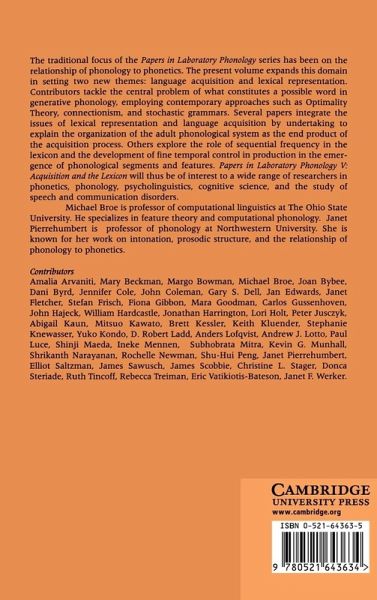 Papers in Laboratory Phonology V sets two new themes: language acquisition and lexical representation. Contributors tackle the central problems of what constitutes a possible phonological word and how the adult phonological system results from the acquisition process. The collection will be of interest to researchers in phonetics, phonology, and psycholinguistics.