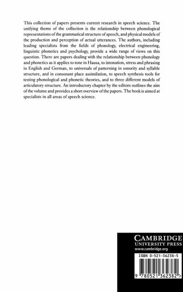 This collection of papers presents current research in speech science. The unifying theme of the collection is the relationship between phonological representations of the grammatical structure of speech, and physical models of the production and perception of actual utterances. The authors, including leading specialists from the fields of phonology, electrical engineering, linguistic phonetics and psychology, provide a wide range of views on this question. There are papers dealing with the relationship between phonology and phonetics as it applies to tone in Hausa, to intonation, stress and phrasing in English and German, to universals of patterning in sonority and syllable structure, and in consonant place assimilation, to speech synthesis tools for testing phonological and phonetic theories, and to three different models of articulatory structure. An introductory chapter by the editors outlines the aim of the volume and provides a short overview of the papers. The book is aimed at specialists in all areas of speech science.