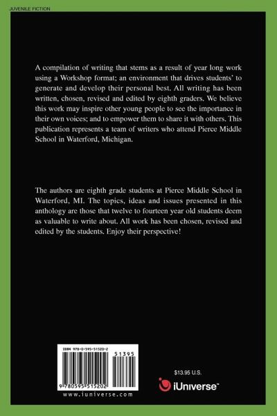 A compilation of writing that stems as a result of year long work using a Workshop format; an environment that drives students' to generate and develop their personal best. All writing has been written, chosen, revised and edited by eighth graders. We believe this work may inspire other young people to see the importance in their own voices; and to empower them to share it with others. This publication represents a team of writers who attend Pierce Middle School in Waterford, Michigan.
