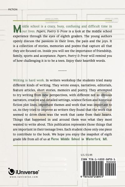 Middle school is a crazy, busy, confusing and difficult time in our lives. Papers, Poetry & Prose is a look at the middle school experience through the eyes of eighth graders. The young authors openly discuss the passions in their lives, the pain and the joys. It is a collection of stories, memories and poems that capture all that they are focused on. Inside you will see the importance of friendship, family, sports and acceptance. Papers, Poetry & Prose will remind you of how challenging it is to be a teen. Enjoy their heartfelt words.