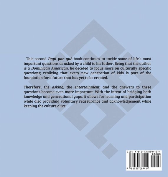 This second Papi por qué book continues to tackle some of life's most important questions as asked by a child to his father. Being that the author is a Dominican American, he decided to focus more on culturally specific questions; realizing that every new generation of kids is part of the foundation for a future that has yet to be created. Therefore, the asking, the entertainment, and the answers to these questions become even more important. With the intent of bridging both knowledge and generational gaps, it allows for learning and participation while also providing voluntary reassurance and acknowledgement at the same time keeping the culture alive.