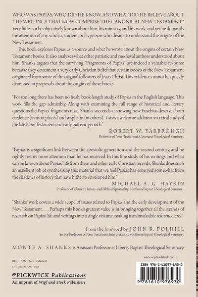 Who was Papias, who did he know, and what did he believe about the writings that now comprise the canonical New Testament? Very little can be objectively known about him, his ministry, and his work, and yet he demands the attention of any scholar, student, or layperson who desires to understand the origins of the New Testament. This book explores Papias as a source and what he wrote about the origins of certain New Testament books. It also analyzes what other patristic and medieval authors understood about him. Shanks argues that the surviving ""Fragments of Papias"" are indeed a valuable resource because they document a very early Christian belief that certain books of the New Testament originated from some of the original followers of Jesus Christ. This evidence cannot be quickly dismissed in proposals about the origins of these books.