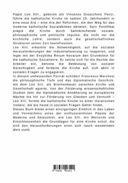 Papst Leo XIII., geboren als Vincenzo Gioacchino Pecci, führte die katholische Kirche im späten 19. Jahrhundert in eine neue Ära - eine Ära der Reformen, die den Weg für das moderne katholische Sozialdenken ebneten. Sein Pontifikat prägte die Kirche durch bahnbrechende soziale, philosophische und politische Impulse, die nicht nur die kirchliche Lehre, sondern auch die gesellschaftlichen Strukturen seiner Zeit beeinflussten.Leo XIII. erkannte die Notwendigkeit, auf die sozialen Herausforderungen der Industrialisierung zu reagieren, und legte mit der Enzyklika Rerum Novarum den Grundstein für die katholische Soziallehre. Er setzte sich für die Rechte der Arbeiter ein, betonte die Bedeutung von sozialer Gerechtigkeit und forderte die Kirche auf, sich aktiv in sozialen Fragen zu engagieren.In diesem umfassenden Porträt schildert Francesco Marchesi die philosophische Tiefe und das diplomatische Geschick, mit dem Leo XIII. als Brückenbauer zwischen Kirche und Gesellschaft agierte. Von der Förderung wissenschaftlicher Studien über die diplomatische Annäherung an europäische Mächte bis hin zur Förderung von Glauben und Vernunft - Leo XIII. formte die katholische Kirche zu einer moralischen Instanz, die bis heute in sozialen Fragen Gehör findet.Dieses Buch bietet einen einzigartigen Einblick in das Leben und Vermächtnis eines der einflussreichsten Päpste der Moderne und beleuchtet, wie Leo XIII. mit Weitsicht und Entschlossenheit die Grundlagen für eine Kirche schuf, die sich den Herausforderungen einer sich rasch wandelnden Welt stellt.