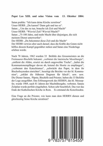 Papst Leo XIII. und seine Vision vom 13. Oktober 1884:Satan prahlte: Ich kann deine Kirche zerstören. Unser HERR: Du kannst? Dann geh und tue es. Satan: Um das zu tun, brauche ich Zeit und Macht Unser HERR: Wieviel Zeit? Wieviel Macht? Satan: 75-100 Jahre, und mehr Macht über diejenigen, die sich meinem Dienst unterwerfen. Der HERR: Du bekommst diese Zeit und die Macht. Der HERR verwies aber auch darauf, dass die Kräfte des Guten nicht hilflos diesem Kampf gegenüber stehen und Satan eine Niederlage erleben werde. Nach 78 Jahren, 1962 wurden 33 Befehle des Grossmeisters an die Freimaurer-Bischöfe bekannt: verbietet die lateinische Messliturgie, entfernt die Altäre, ersetzt sie durch ungeweihte Tische, haltet die Kommunionempfänger davon ab, kniend die Hostie zu empfangen, verbrennt den Katechismus, schwächt den Papst, in dem ihr Bischofssynoden einrichte, beseitigt die Beichte vor der hl. Kommunion, erklärt die früheren Dogmen für falsch, usw. usw. Die Diener Satans, Päpste, Bischöfe und Priester, haben die 33 Befehle der Loge ausgeführt. Das Erlösungswerk des HERRN, das hl. Messopfer, wurde 1969, nach 81 Jahren der Machtübergabe an Satan, verboten. Satans Zeitplan wurde perfekt eingehalten. Das war das Ende der Katholischen Kirche in Rom. Es entstand die Konzilssekte.