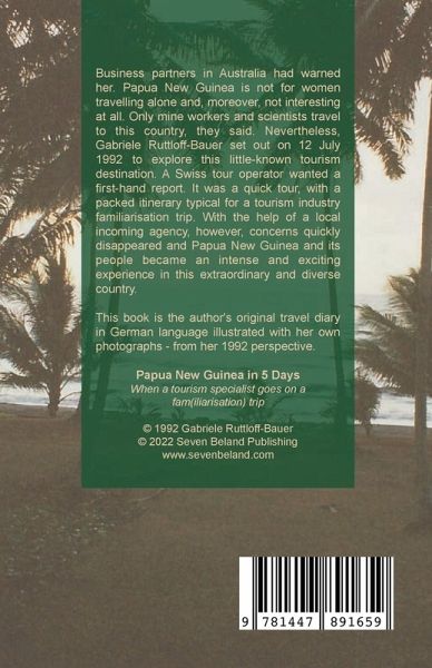 Business partners in Australia had warned her. Papua New Guinea is not for women travelling alone and, moreover, not interesting at all. Only mine workers and scientists travel to this country, they said. Nevertheless, Gabriele Ruttloff-Bauer set out on 12 July 1992 to explore this little-known tourism destination. A Swiss tour operator wanted a first-hand report. It was a quick tour, with a packed itinerary typical for a tourism industry familiarisation trip. With the help of a local incoming agency, however, concerns quickly disappeared and Papua New Guinea and its people became an intense and exciting experience in this extraordinary and diverse country. This book is the author's original travel diary in German language illustrated with 78 of her own photographs - from her 1992 perspective. (Please note: this book will be printed on demand on standard colour paper)