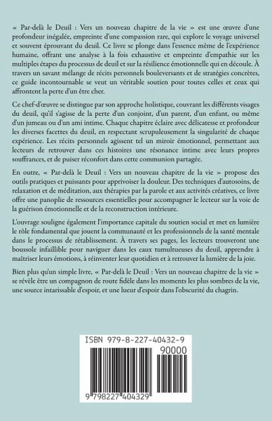 Par-delà le Deuil : Vers un nouveau chapitre de la vie est une ¿uvre d'une profondeur inégalée, empreinte d'une compassion rare, qui explore le voyage universel et souvent éprouvant du deuil. Ce livre se plonge dans l'essence même de l'expérience humaine, offrant une analyse à la fois exhaustive et empreinte d'empathie sur les multiples étapes du processus de deuil et sur la résilience émotionnelle qui en découle. À travers un savant mélange de récits personnels bouleversants et de stratégies concrètes, ce guide incontournable se veut un véritable soutien pour toutes celles et ceux qui affrontent la perte d'un être cher. Ce chef-d'¿uvre se distingue par son approche holistique, couvrant les différents visages du deuil, qu'il s'agisse de la perte d'un conjoint, d'un parent, d'un enfant, ou même d'un jumeau ou d'un ami intime. Chaque chapitre éclaire avec délicatesse et profondeur les diverses facettes du deuil, en respectant scrupuleusement la singularité de chaque expérience. Les récits personnels agissent tel un miroir émotionnel, permettant aux lecteurs de retrouver dans ces histoires une résonance intime avec leurs propres souffrances, et de puiser réconfort dans cette communion partagée. En outre, Par-delà le Deuil : Vers un nouveau chapitre de la vie propose des outils pratiques et puissants pour apprivoiser la douleur. Des techniques d'autosoins, de relaxation et de méditation, aux thérapies par la parole et aux activités créatives, ce livre offre une panoplie de ressources essentielles pour accompagner le lecteur sur la voie de la guérison émotionnelle et de la reconstruction intérieure. L'ouvrage souligne également l'importance capitale du soutien social et met en lumière le rôle fondamental que jouent la communauté et les professionnels de la santé mentale dans le processus de rétablissement. À travers ses pages, les lecteurs trouveront une boussole infaillible pour naviguer dans les eaux tumultueuses du deuil, apprendre à maîtriser leurs émotions, à réinventer leur quotidien et à retrouver la lumière de la joie. Bien plus qu'un simple livre, Par-delà le Deuil : Vers un nouveau chapitre de la vie se révèle être un compagnon de route fidèle dans les moments les plus sombres de la vie, une source intarissable d'espoir, et une lueur d'espoir dans l'obscurité du chagrin. Cet ouvrage est une ressource inestimable, tant pour ceux qui cherchent à panser les plaies de leur c¿ur après une perte, que pour les professionnels de la santé et du bien-être qui accompagnent des personnes endeuillées. Par son approche bienveillante et pragmatique, ce livre s'impose comme une référence incontournable dans le domaine de la littérature sur le deuil, la résilience et la guérison émotionnelle.