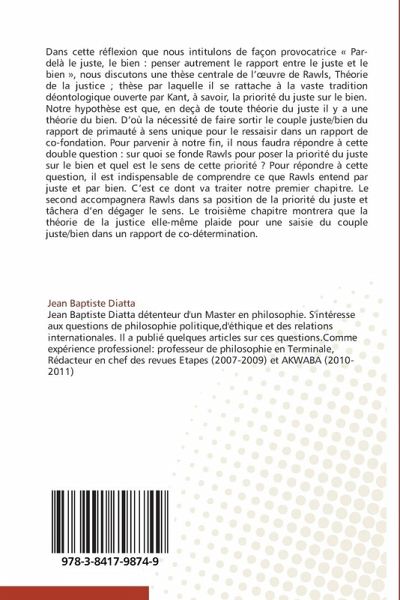 Dans cette réflexion que nous intitulons de façon provocatrice " Par-delà le juste, le bien : penser autrement le rapport entre le juste et le bien ", nous discutons une thèse centrale de l uvre de Rawls, Théorie de la justice ; thèse par laquelle il se rattache à la vaste tradition déontologique ouverte par Kant, à savoir, la priorité du juste sur le bien. Notre hypothèse est que, en deçà de toute théorie du juste il y a une théorie du bien. D où la nécessité de faire sortir le couple juste/bien du rapport de primauté à sens unique pour le ressaisir dans un rapport de co-fondation. Pour parvenir à notre fin, il nous faudra répondre à cette double question : sur quoi se fonde Rawls pour poser la priorité du juste sur le bien et quel est le sens de cette priorité ? Pour répondre à cette question, il est indispensable de comprendre ce que Rawls entend par juste et par bien. C est ce dont va traiter notre premier chapitre. Le second accompagnera Rawls dans sa position de la priorité du juste et tâchera d en dégager le sens. Le troisième chapitre montrera que la théorie de la justice elle-même plaide pour une saisie du couple juste/bien dans un rapport de co-détermination.