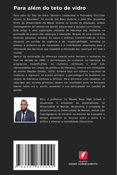 Para além do Teto de Vidro: Women's Leadership in Promoting Girl-Child Access to Education" foi escrito por Boru Dulacha e pela Dra. Josephine Kirimi da Universidade do Monte Quénia na escola de Educação, ambos investigadores de renome em gestão educacional e estudos curriculares.Este artigo é uma exploração cativante da liderança das mulheres na promoção do acesso das raparigas à educação. Através de uma mistura de histórias pessoais, estudos de casos e análises transformadoras, o livro desperta um sentido de urgência e de responsabilidade. Incentiva os leitores a juntarem-se ao movimento e a contribuírem ativamente para a eliminação das barreiras que impedem a educação das raparigas em todo o mundo.Apesar da declaração da diferença salarial entre homens e mulheres no final da década de 1990, a percentagem de mulheres na liderança fez progressos insignificantes. As mulheres continuam a estar sub-representadas em cargos de gestão e de liderança, mesmo em instituições de ensino (Nações Unidas, 2016). Embora haja um número crescente de mulheres a ingressar no ensino primário, a percentagem de mulheres em cargos de liderança continua a diminuir. Para encontrar uma resposta, as raparigas das escolas primárias devem ser orientadas para se tornarem líderes nesta era e, assim, aumentar a sua participação em funções de gestão.