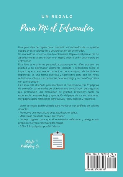 Una gran idea de regalo para compartir los recuerdos de su querido equipo en este colorido libro de apreciación del entrenador. Un maravilloso recuerdo para tu entrenador. Regalo ideal para el día de agradecimiento al entrenador o un regalo sincero de fin de año para su entrenador. Este libro es una forma personalizada para que los niños expresen su gratitud a su entrenador altamente valorado y reflexionen sobre el impacto que su entrenador ha tenido con su conjunto de habilidades deportivas. Es una forma divertida y significativa para que los niños reflexionen sobre sus experiencias de aprendizaje y la conexión positiva con su entrenador. Este libro está diseñado para mantener el compromiso con 25 páginas de extensión. Las entradas del Libro son una combinación de preguntas que promueven una mentalidad de gratitud, reflexiones sobre su experiencia de aprendizaje y apreciación del papel de sus entrenadores. Hay páginas para reflexiones significativas, fotos, escritos y recuerdos. - Libro de regalo personalizado para maestros con gráficos de colores vibrantes. - Promueve una mentalidad de gratitud para el atleta. - Maravilloso recuerdo para el entrenador - Incluye páginas para que el entrenador reflexione y agregue sus propios recuerdos especiales del equipo - Cuaderno / diario de 6.69 x 9.61 pulgadas