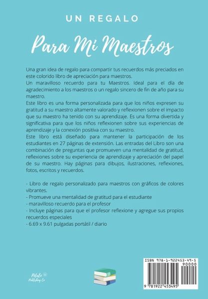 Una gran idea de regalo para compartir tus recuerdos más preciados en este colorido libro de apreciación para maestros. Un maravilloso recuerdo para tu Maestros. Ideal para el día de agradecimiento a los maestros o un regalo sincero de fin de año para su maestro. Este libro es una forma personalizada para que los niños expresen su gratitud a su maestro altamente valorado y reflexionen sobre el impacto que su maestro ha tenido con su aprendizaje. Es una forma divertida y significativa para que los niños reflexionen sobre sus experiencias de aprendizaje y la conexión positiva con su maestro. Este libro está diseñado para mantener la participación de los estudiantes en 27 páginas de extensión. Las entradas del Libro son una combinación de preguntas que promueven una mentalidad de gratitud, reflexiones sobre su experiencia de aprendizaje y apreciación del papel de su maestro. Hay páginas para dibujos, ilustraciones, reflexiones, fotos, escritos y recuerdos. - Libro de regalo personalizado para maestros con gráficos de colores vibrantes. - Promueve una mentalidad de gratitud para el estudiante - maravilloso recuerdo para el profesor - Incluye páginas para que el profesor reflexione y agregue sus propios recuerdos especiales - 6.69 x 9.61 pulgadas portátil / diario