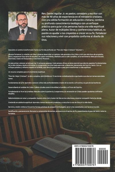 Descubre un camino transformador hacia una fe más profunda con "Para Ser Mejor Cristiano" Semanas 1-12. ¿Buscas fortalecer tu relación con Dios? ¿Quieres desarrollar un carácter más parecido al de Cristo y vivir una vida llena de propósito, amor y esperanza? Este libro de estudio, en cuatro volúmenes, diseñado para un año completo, es la herramienta ideal para Escuela Dominical, Clases de Discipulado o Crecimiento Personal. En este primer volumen se incluyen las 12 primeras semanas. Cada semana ofrece un tema esencial que aborda aspectos fundamentales de la vida cristiana, desde profundizar tu compromiso con Dios hasta aprender a depender plenamente del Espíritu Santo. Con un enfoque práctico, reflexivo y basado en la Biblia, este libro te guiará paso a paso para transformar tu vida espiritual. Un recurso completo para el crecimiento espiritual. "Para Ser Mejor Cristiano", la obra completa, está dividida en 13 secciones cuidadosamente organizadas que abarcan temas esenciales como: * Fundamentos de la fe: Aprende a conocer a Dios más profundamente a través de la oración, la fe activa y la guía de las Escrituras. * Desarrollando el carácter de Cristo: Cultiva virtudes como la humildad, el perdón y el fruto del Espíritu. * Fortaleciendo tu fe en las pruebas: Descubre cómo la paciencia, la esperanza y la renovación en Cristo pueden ayudarte a enfrentar desafíos. * Relacionándote con amor y compasión: Explora cómo vivir el amor de Dios en tus relaciones y mostrar compasión hacia los demás. * Creciendo en sabiduría espiritual: Aprende a tomar decisiones prudentes y a escuchar la voz de Dios en tu vida diaria. * Servicio y misión cristiana: Encuentra formas prácticas de compartir el Evangelio, servir a los necesitados y ser luz en el mundo. * Santificación y perseverancia: Renueva tu compromiso de pureza, persevera en el camino de fe y experimenta el gozo del Señor como tu fortaleza. Características clave del libro. * Versículos bíblicos semanales para guiar tu meditación y estudio. * Reflexiones profundas y ejercicios prácticos para aplicar lo aprendido. * Desafíos semanales que te animan a crecer en tu fe de manera tangible. * Cuestionarios y acciones prácticas para evaluar y consolidar tu aprendizaje. Este libro no solo es una guía espiritual, sino también una invitación a una transformación completa. Ya sea que lo uses en grupo o en tu tiempo personal, te equipará para vivir una vida cristiana más significativa y con propósito. Un libro para todos los cristianos. Ideal para jóvenes y adultos en cualquier etapa de su fe, este recurso es perfecto para iglesias, líderes de ministerio, o cualquier creyente que desee comprometerse con un plan estructurado de crecimiento espiritual. Con "Para Ser Mejor Cristiano", encontrarás inspiración, sabiduría y herramientas prácticas para vivir en plenitud según el diseño de Dios. ¡Empieza hoy este emocionante viaje hacia una relación más profunda con Cristo y experimenta la transformación total de tu vida espiritual! (Material didáctico adicional accesible mediante código QR).