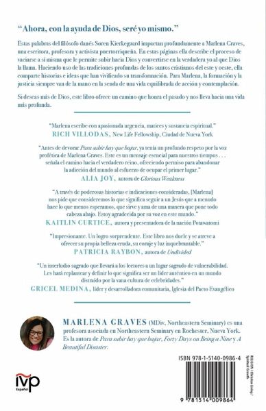 "Ahora, con la ayuda de Dios, seré yo mismo." Estas palabras del filósofo danés Søren Kierkegaard impactan profundamente a Marlena Graves, una escritora, profesora y activista puertorriqueña. En estas páginas ella describe el proceso de vaciarse a sí misma que le permite subir hacia Dios y convertirse en la verdadera yo a que Dios la llama. Haciendo uso de las profundas tradiciones de los santos cristianos del este y del oeste, ella comparte historias e ideas que han vivificado su transformación. Para Marlena, la formación y la justicia siempre van mano a mano en la senda de una vida balanceada de acción y contemplación. Si deseas más de Dios, este libro ofrece un camino que honra el pasado hacia una vida más profunda.