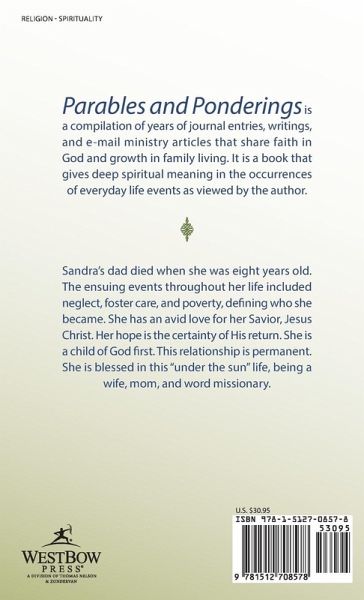 Parables and Ponderings is a compilation of years of journal entries, writings, and e-mail ministry articles that share faith in God and growth in family living. It is a book that gives deep spiritual meaning in the occurrences of everyday life events as viewed by the author.