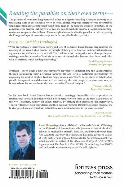 For far too long, Lauri Thurn argues, the parables of Jesus have been read either as allegories encoding Christian theologyincluding the theological message of one or another Gospel writeror as tantalizing clues to the authentic voice of Jesus. Thurn proposes instead to read the parables "unplugged" from any assumptions beyond those given in the narrative situation in the text, on the common-sense premise that the very form of the parable works to propose a (sometimes startling) resolution to a particular problem. Thurn applies his method to the parables in Luke with some surprising results involving the Evangelists overall narrative purposes and the discrete purposes of individual parables in supporting the authority of Jesus, proclaiming God's love, exhorting steadfastness, and so on. Eschatological and allegorical readings are equally unlikely, according to Thurn's results. This study is sure to spark learned discussion among scholars, preachers, and students for years to come.
