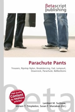 High Quality Content by WIKIPEDIA articles! Parachute pants are a style of trousers characterised by the use of ripstop nylon and/or extremely baggy cuts. In the original loose-fitting, extraneously zippered style of the late 70s, "parachute" referred to the pants' synthetic nylon material. In the later 80s, "parachute" may have referred to the extreme bagginess of the pant. They are typically worn as menswear and are often brightly colored. Parachute pants became a fad in US culture in the 1980s as part of an increased cultural appropriation of breakdancing.