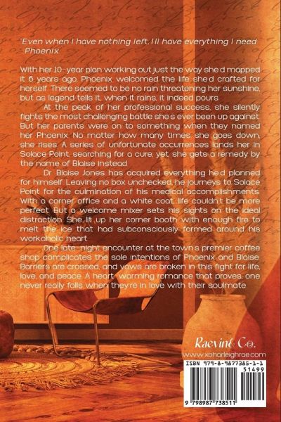 "Even when I have nothing left, I'll have everything I need." -Phoenix. With her 10-year plan working out just the way she'd mapped it 6 years ago, Phoenix welcomed the life she'd crafted for herself. There seemed to be no rain threatening her sunshine, but as legend tells it, when it rains, it indeed pours. At the peak of her professional success, she silently fights the most challenging battle she's ever been up against. But her parents were on to something when they named her Phoenix. No matter how many times she goes down, she rises. A series of unfortunate occurrences lands her in Solace Point, searching for a cure, yet, she gets a remedy by the name of Dr. Blaise Jones instead. Dr. Blaise Jones has acquired everything he'd planned for himself. Leaving no box unchecked, he journeys to Solace Point for the culmination of his medical accomplishments. With a corner office and a white coat, life couldn't be more perfect. But a welcome mixer sets his sights on the ideal distraction. She lit up her corner booth with enough fire to melt the ice that had subconsciously formed around his workaholic heart. One late-night encounter at the town's premier coffee shop complicates the sole intentions of Phoenix and Blaise. Barriers are crossed, and vows are broken in this fight for life, love, and peace. A heart-warming romance that proves, one never really falls when they're in love with their soulmate.