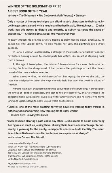 Winner of the Goldsmiths Prize Named a Best Book of the Year (So Far) by The New Yorker and Vulture From Rachel Cusk, author of the Outline trilogy, comes this startling, exhilarating novel that once again expands the notion of what fiction can be and do. Midway through his life, the artist G begins to paint upside down. Eventually, he paints his wife upside down. He also makes her ugly. The paintings are a great success. In Paris, a woman is attacked by a stranger in the street. Her attacker flees, but not before turning around to contemplate her victim, like an artist stepping back from a canvas. At the age of twenty-two, the painter G leaves home for a new life in another country, far from the disapproval of her parents. Her paintings attract the disapproval of the man she later marries. When a mother dies, her children confront her legacy: the stories she told, the roles she assigned to them, the ways she withheld her love. Her death is a kind of freedom. Parade is a novel that demolishes the conventions of storytelling. It surges past the limits of identity, character, and plot to tell the story of G, an artist whose life contains many lives. Rachel Cusk is a writer and visionary like no other, who turns language upside down to show us our world as it really is.